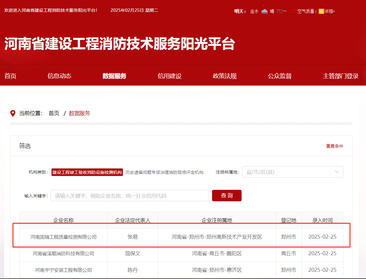 熱烈祝賀河南固瑞工程質(zhì)量檢測有限公司入冊河南省建設(shè)工程消防技術(shù)服務(wù)陽光平臺?。。?